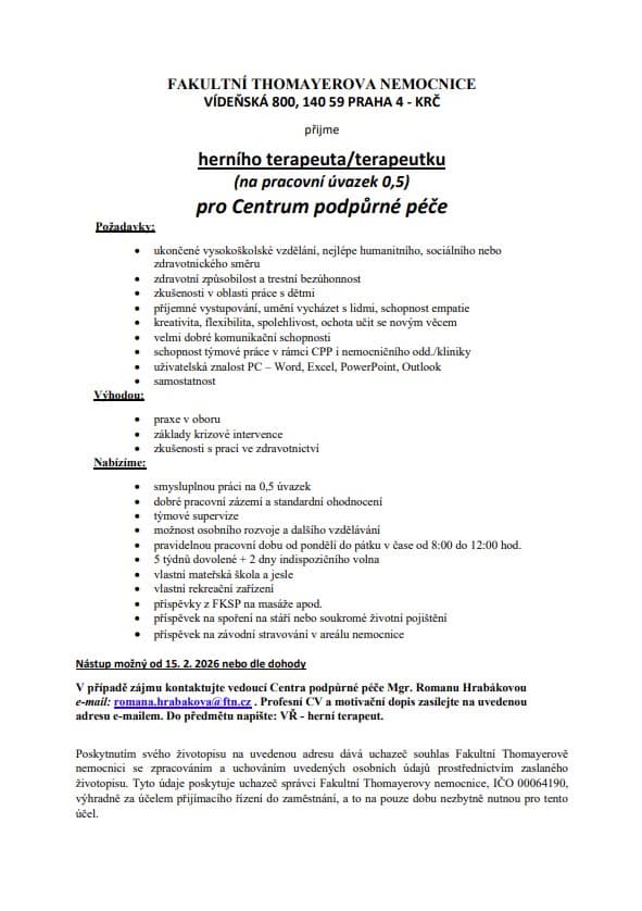 Hledáme nového herního terapeuta20. 1. 2026Hledáme herního terapeuta či terapeutku na 0,5 úvazek. Bližší informace jsou v přiloženém inzerátu. V případě zájmu nás, prosíme, kontaktujte na e-mailu: romana.hrabakova@ftn.cz. Děkujeme, Tým CPP. Herní terapeut inzerát 2026